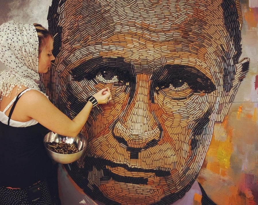 This is “The Face of War” by Ukrainian artist Dariya Marchenko. It was made with 5,000 bullet casings. It seemed simply too powerful and timely for me not to repost here.