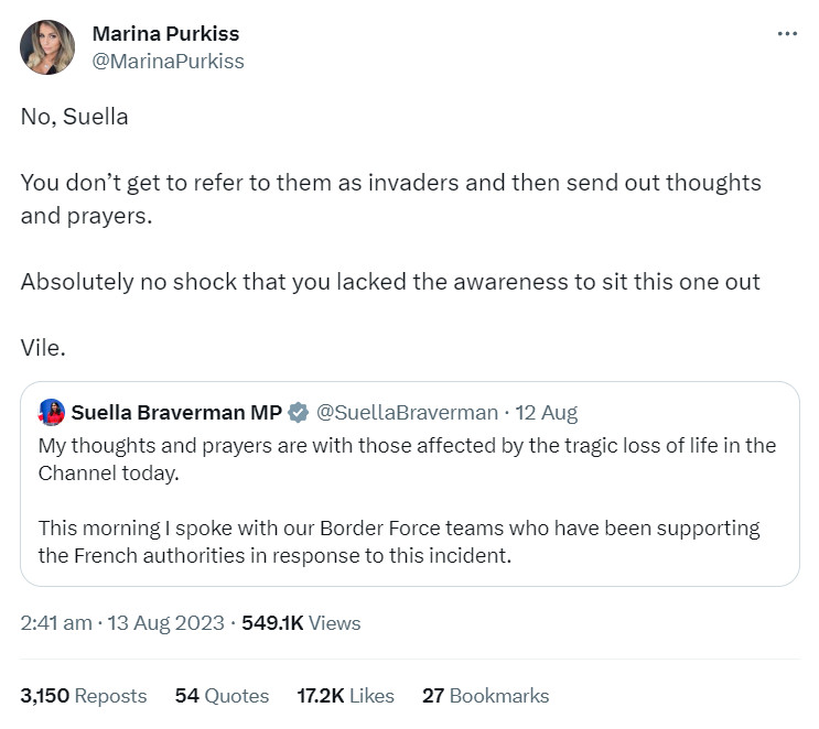 I think I need to share this here today, simply because the two-faced hypocrisy is so gut-wrenching. For Braverman to act so callously towards immigrant one moment, and then to try to pretend she cares for their welfare when a tragedy occurs, truly is sickening. I suppose it depends who she thinks is listening and who she wants to appeal to in a given moment, but that’s Tories for you.